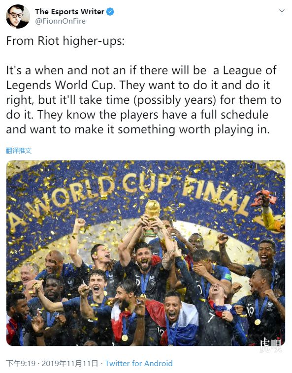 在答复中,这位高管称,举办LOL世界杯最需要的是时间,这可能需要好几年,“因为选手们的赛程已经非常紧了,需要让世界杯成为值得选手参加的比赛”。而拳头中国的负责人Leo也在最近的媒体采访中表示:前提是要先把英雄联盟联赛制度重新规划,腾出时间让各个国家有时间选拔国家队。