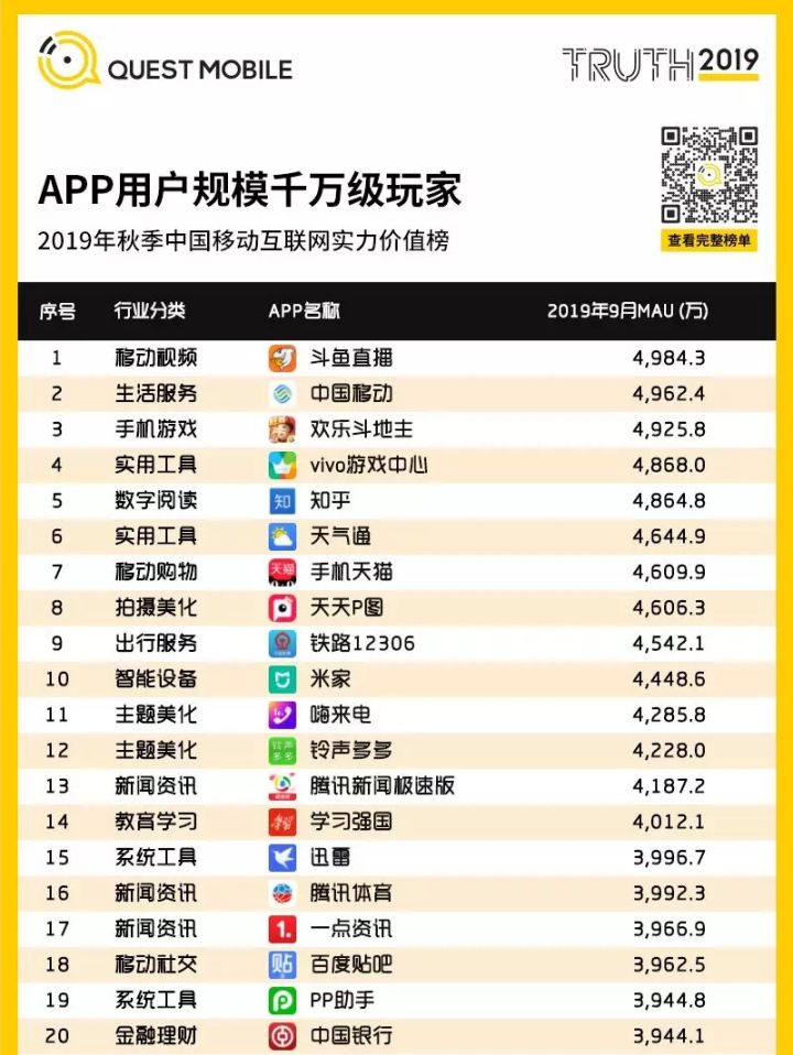 QM秋季数据,斗鱼直播凭借近5000万MAU,位列千万级APP用户第一。
