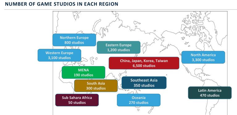 根据我们的研究报告,可以看一下各个区域国家的游戏开发工作室有多少。新兴市场的开发公司比较少,不过还是在增长,东欧大概1200个工作室。