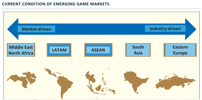 中东、北非我们认为是市场驱动的。对于游戏开发公司和工作室,尤其是在阿拉伯国家是很难找到好的合作伙伴,中东和北非的市场规模大概30亿美元。在拉美有很多的游戏公司,游戏市场大概是25亿美元。东南亚比较平衡,有很好的开发公司,也有很好的市场,是很好的找到合作伙伴的地方。