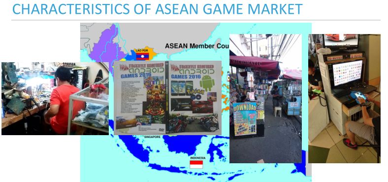 泰国,PC和手游市场有非常好的平衡。越南,有很多的中国游戏公司都在那卖游戏,游戏机市场非常小,几乎为零。印尼是一个非常有潜力的市场,我拍了照片,是印度尼西亚修理游戏的小作坊,这个盘不光用于PC,还可以用于手游。菲律宾有下载店,比如说买了手机,在下载店待一个小时,就可以下载一百多个应用。去菲律宾、印尼这样的国家都可以找到软件下载店。所以如果只是在Google Play或者App Store上线游戏,机会就缺失了。