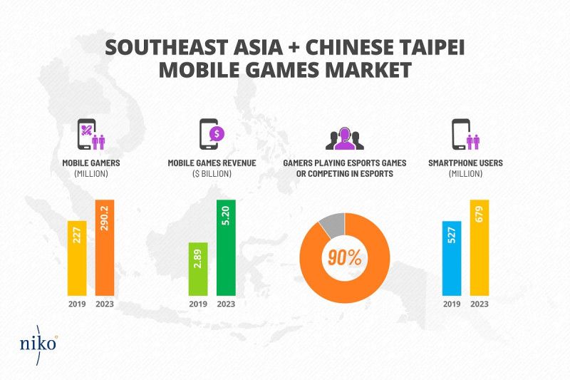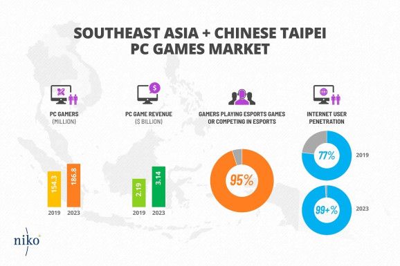 根据市场调查机构Niko Partners的报告,东南亚和台湾的PC与手游市场收入在2019年达到50亿美元,并将在2023年超过83亿美元。