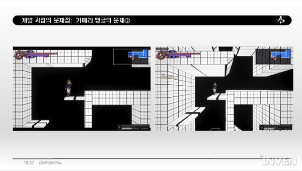 而开发过程中很难的一点,是画面角度的问题。角度变大会产生扭曲,这对于2D横版跳跃动作来说无疑是致命的缺陷。因为在跳跃时,脚踩在什么地方都看不清,有时还会出现角色被挡在墙后的问题。因此,《血污:夜之仪式》画面角度定为20度,根据情况将画面角度降低到10度。