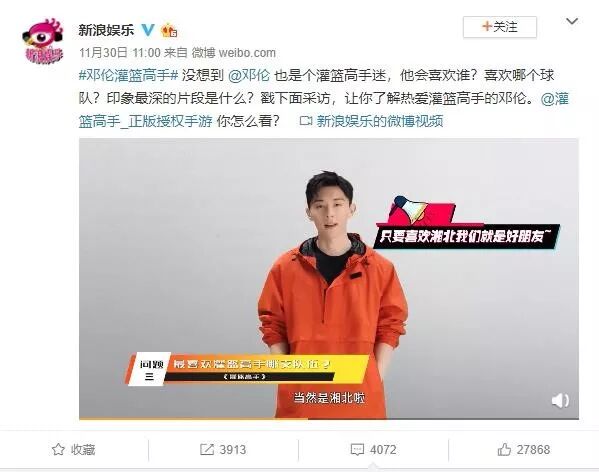 11月30日,邓伦x灌篮高手的快问快答视频,收获了近万条评论,同时在粉丝的疯传后,#邓伦灌篮高手#话题直接冲击热搜榜。