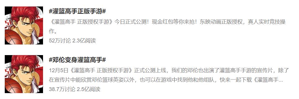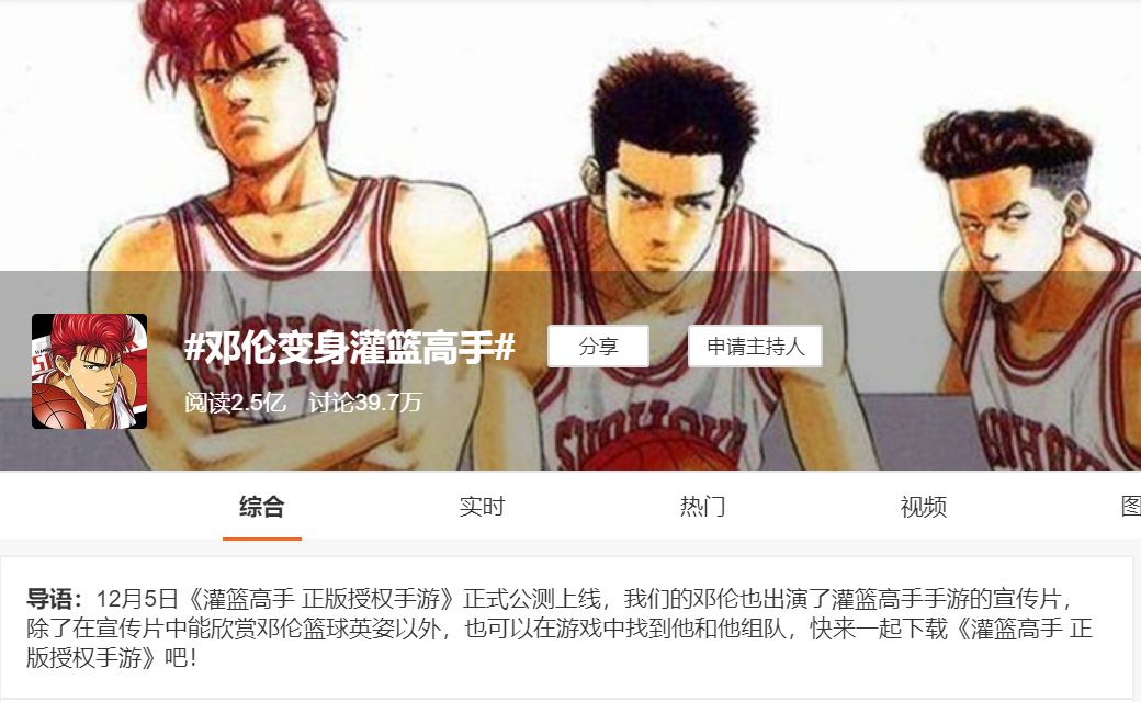 12月5日,公测日,官方正式公布了邓伦参与演出的新《灌篮高手 正版授权手游》的宣传视频,同步#邓伦变身灌篮高手#、#灌篮高手正版手游#两个话题冲击了热搜榜,话题阅读量突破2亿。由此可见邓伦与灌篮高手的结合,可谓“梦幻组合”。