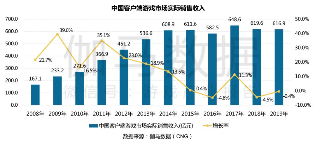 2019年,端游市场实际销售收入616.9亿人民币,保持平稳发展。虽然《魔兽世界怀旧服》带来了较高增量,但未能扭转市场走势,也表明了端游市场仍在衰退。