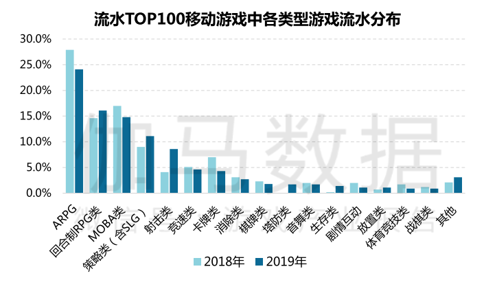 2019年,流水TOP100移动游戏中,ARPG类流水占比虽仍是排名靠前,但相比2018年有所下降,不足25%;同时,各类型游戏的流水分布更趋于分散,射击类、策略类、塔防类等占比都出现明显增长,而这种分化主要受品类爆款驱动。