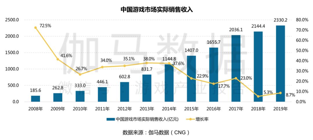 其中,中国游戏市场实际销售收入达2330.2亿人民币,增速与去年的5.3%相比有小幅回升,为8.7%。而这主要受益于移动游戏市场实际销售收入增速平稳,而客户端游戏市场实际销售收入同比下降幅度收窄。