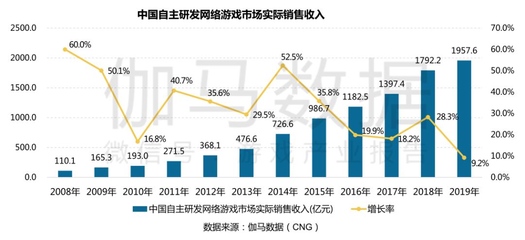 相反,2019年,中国自主研发网络游戏市场实际销售收入增速出现下滑,从2018年的28.3%降为9.2%,收入1957.6亿人民币。一方面是由于页游、端游市场自研产品双重下滑,另一方面是因为移动游戏市场增速也出现趋缓状态。