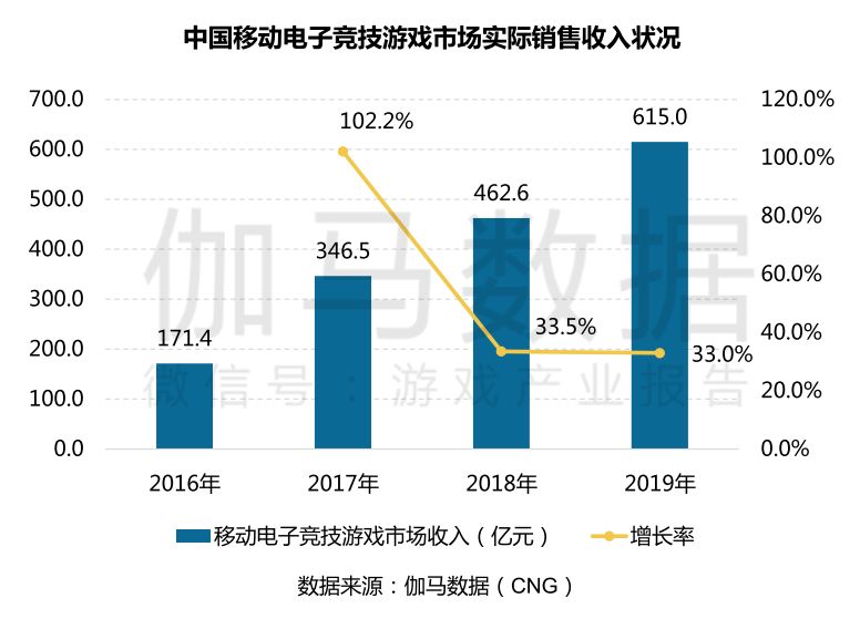 2019年,中国移动电竞游戏市场实际销售收入615亿人民币,增长率为33%。目前,客户端电竞游戏占客户端游戏市场约6成份额,而移动电竞游戏在移动游戏市场占有率仅超过4成,未来仍有拓展空间。