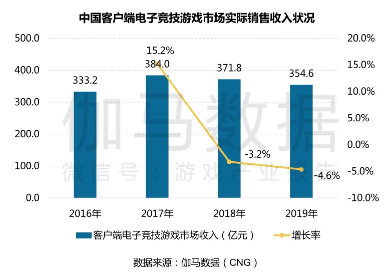 2019年中国客户端电竞游戏市场实际销售收入相较2018年波动不大,为354.6亿人民币,主要收入来源于少数头部产品。但随着主流客户端游戏IP衍生移动产品的出现,预计客户端电子竞技游戏用户将有一定流失。