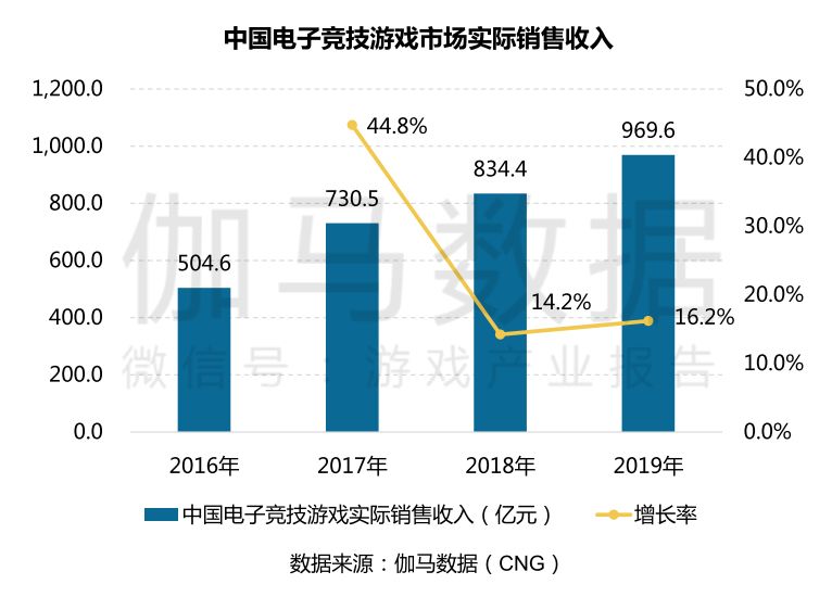 2019年,中国电子竞技游戏市场规模为969.6亿人民币,增速略有提升,为16.2%。伽马数据分析,未来电竞游戏市场规模的主要增量将来自两方面:一是端游IP的转化,如《英雄联盟》将推出手游版;二是玩法的突破。