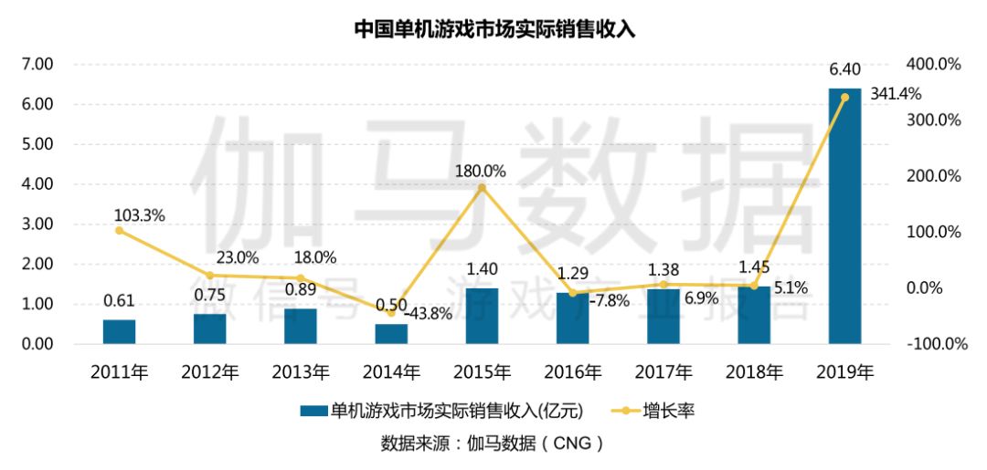 2019年,得益于单机游戏发行平台的不断成熟,比如WeGame平台单机游戏累计销量达千万级,中国单机游戏市场实际销售收入大幅涨至6.4亿人民币,增幅高达341.4%。