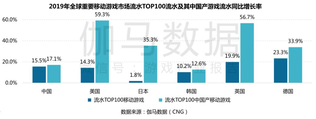 2019年,中国自主研发的产品,在美、日、韩、英、德等国家的流水同比增长率,均高于其流水TOP100产品的流水增长率。其中,英、美两国的中国自研产品流水同比增长率均超过50%。国产移动游戏厂商研发实力提升,出海前景明朗。