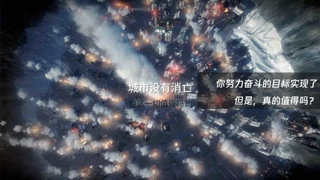 再来看下《冰汽时代》。你打通结局了,城市没有消亡,但是你在此过程中却做出了很多践踏道德底线的抉择:比如你签署通过了童工法案,比如你为了节省劳动力决定不为故去的人们下葬……你让城市得以幸存,但屏幕上“这一切值得吗?”的一行字,是所有玩家需要直面的一个问题。