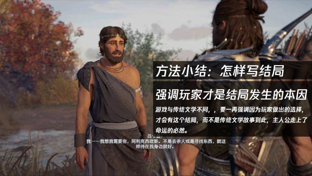 那么,怎么撰写结局?我的看法是:策划需要在结局中强调玩家才是结局发生的本因。怎么解释?我们可以来看一个反例。在《刺客信条:奥德赛》DLC中,当玩家扮演女主角Kassandra时,会在主线剧情结尾出现怀孕的剧情。但由于很多玩家在游戏中选择的是同性恋的剧情走向,导致结尾的怀孕剧情与此前的选择发生矛盾,也不符合育碧当初营销游戏时所宣传的“自由塑造角色甚至性取向”的玩法,所以遭到了部分玩家在社交媒体的声讨。而这种游戏进程中开放了“同性恋”的选择,但是在结局末尾又欠缺思考地做了强制的收束,就是做剧情策划必须避免的失误。而育碧在这次事故之后也是紧急进行了修复,将结局的怀孕情节改为分支结局,而非固定的结局。