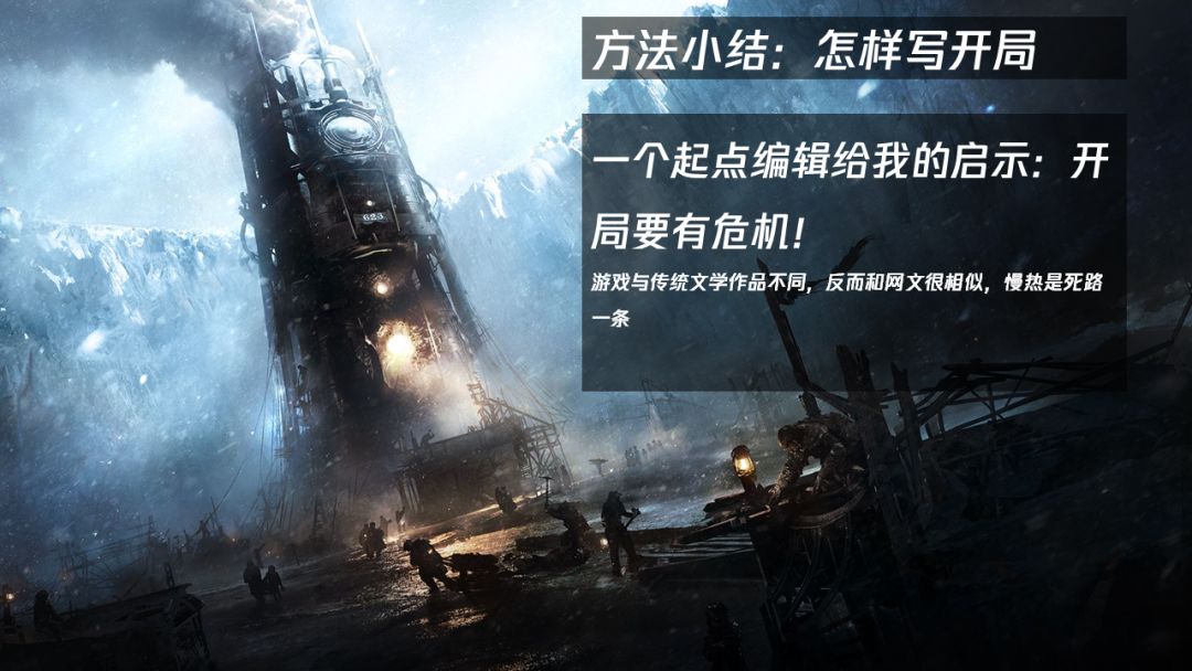 所以,游戏应该如何开局?这里有一个方法可以与大家分享,区别于传统文学,游戏可能与网文有更多相似之处,需要在开头便抓住玩家的注意力。