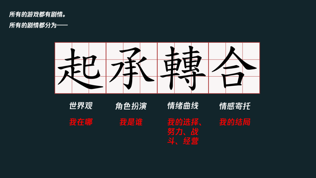总结起来,这些关于世界观,角色等等的塑造就是四个字:起承转合。从世界观开始,将游戏角色的定位(我是谁,玩家的目标),玩家的游戏过程(也就是玩法)以及后来的情感寄托(结局)交代清楚,才能称之为是一个完整的剧情。