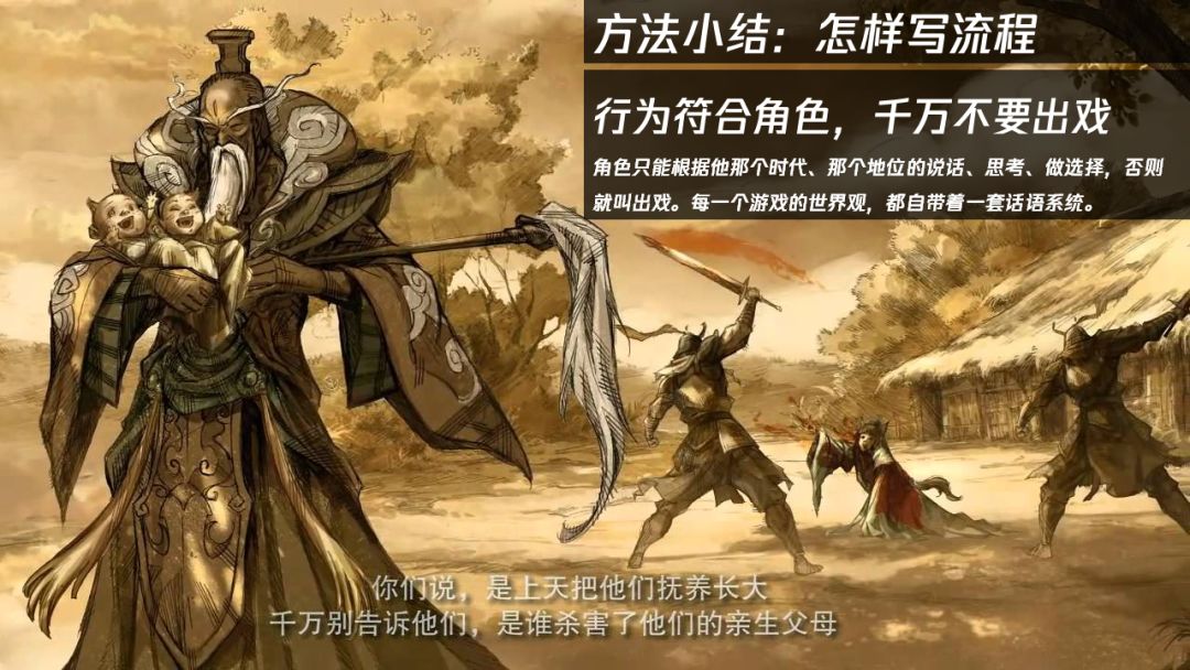 所以,游戏剧情不是一个txt文本,不是一个200页的任务对话,它应该是一个系统。再具体到日常工作中,当一个策划和美术提需求,画一张怪物的概念图时,你所给出的肯定不是狂拽酷炫等形容词,而是这个怪物的出身、栖息地、能力的具体描写。