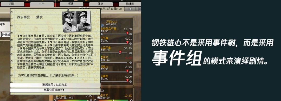 我们来看一下经典的案例。在《钢铁雄心》这个游戏中,每一个设计都归属于游戏中的某一套AI逻辑下的事件组,游戏区别于传统的事件树剧情,而是采用事件组的模式来演绎。