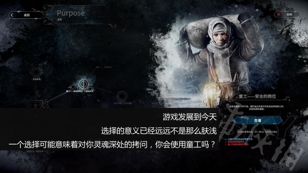 而从1996年到2018年,这套逻辑依旧不曾改变。不过,伴随着我们时代的发展,现在游戏中给予玩家的选择也开始触及一些尖锐的社会问题。在游戏《冰汽时代》中,面对资源匮乏、气候骤变的生存环境,玩家被赋予了是否使用童工的选项,选择后还会直接展示出童工法案的后果,类似的选择还有很多,在游戏的代入感中触动人心。