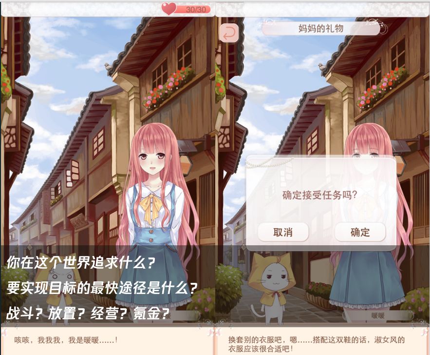 再比如现在已经出到第四代的换装游戏,也是一脉传承的目标指引。由大喵告诉暖暖(也就是玩家),在这个以搭配论输赢的奇迹大陆,需要根据不同的场合地点,进行搭配任务。而不同的任务需要玩家收集不同的衣服,进行抽取、购买、染色、进化等等一系列操作。