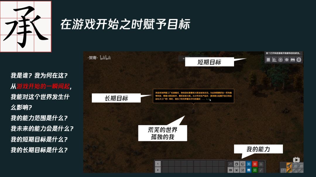 再来是承这一阶段,也就是在游戏开局,玩家点击开始游戏时所铺展开的游戏目标,也与“起”这个阶段紧密相扣。图中所示是《异星工厂》的开头,玩家被扔到了一片荒芜的空地上,在一段背景介绍后,作为飞船坠机事故幸存者的你,便被赋予了长期与短期的两个目标,长期目标自然是逃离这个星球,逃离星球需要火箭,制造火箭需要科技,科技需要研发,研发需要材料,材料需要工厂制作,制作需要资源,于是玩家的短期目标出来了,一把斧头在身,开始挖煤砍树的异星改造之旅。