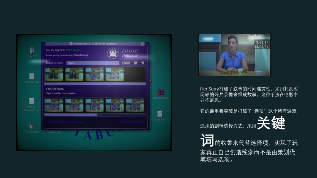 《Her Story》打破了叙事的时间连贯性,采用打乱时间轴的碎片录像来组成故事。这种手法在电影中并不鲜见。它重要的突破是打破了“选项”这个所有游戏通用的剧情选择方式,采用关键词的收集来代替选择项,玩家需要从叙事中提炼关键词。