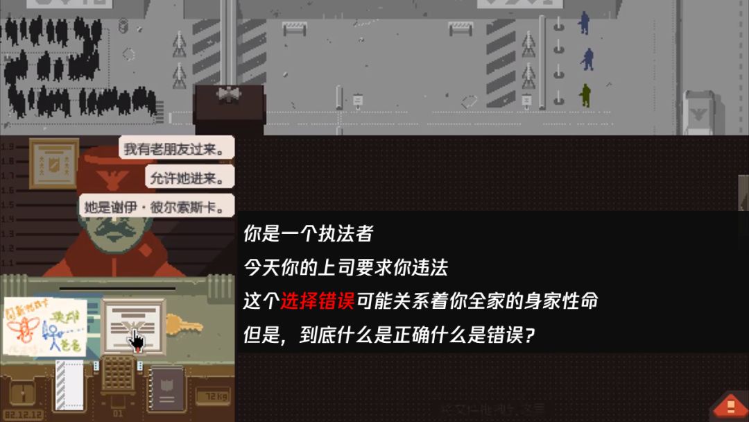 而在《Papers,Please》中,玩家作为一个边境警察,有妻儿要糊口,有可怜的难民渴望入境,有上司贪赃枉法,有恐怖的考核不允许你犯错,这时候出现一个任务选择——上司胁迫你帮忙偷渡朋友,也是典型的两难选择,代入感越深的玩家选择越困难,越直击内心。