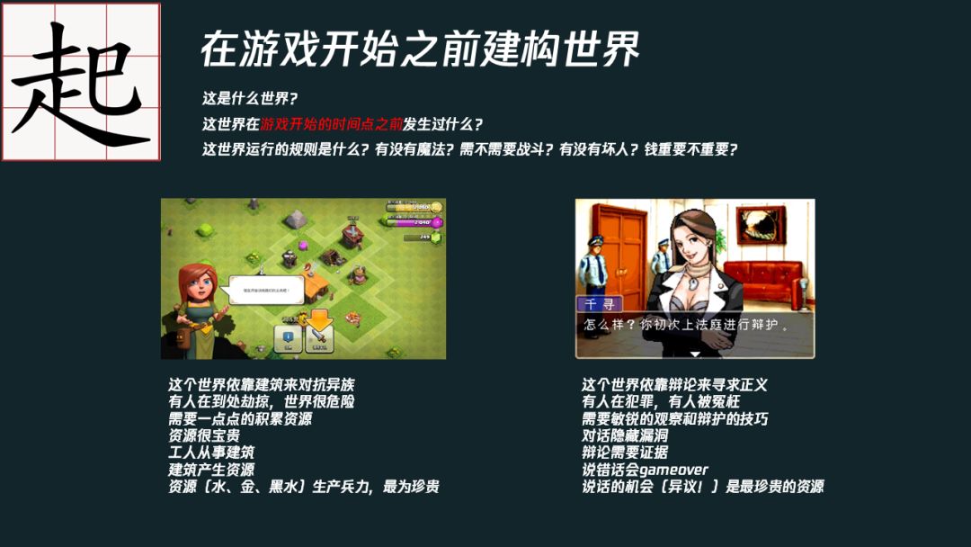 起就是构建游戏开始前的世界,相当于影视剧中的前情提要,一个玩家进入游戏前便已规划好的背景。比如《部落冲突》的背景中,整个世界是依靠建筑来对抗异族,而水、金、黑水这些玩家需要用于生产兵力的自然资源则格外珍贵。所以对于地图和资源的争夺从玩家一开始游戏便已经植入其中。