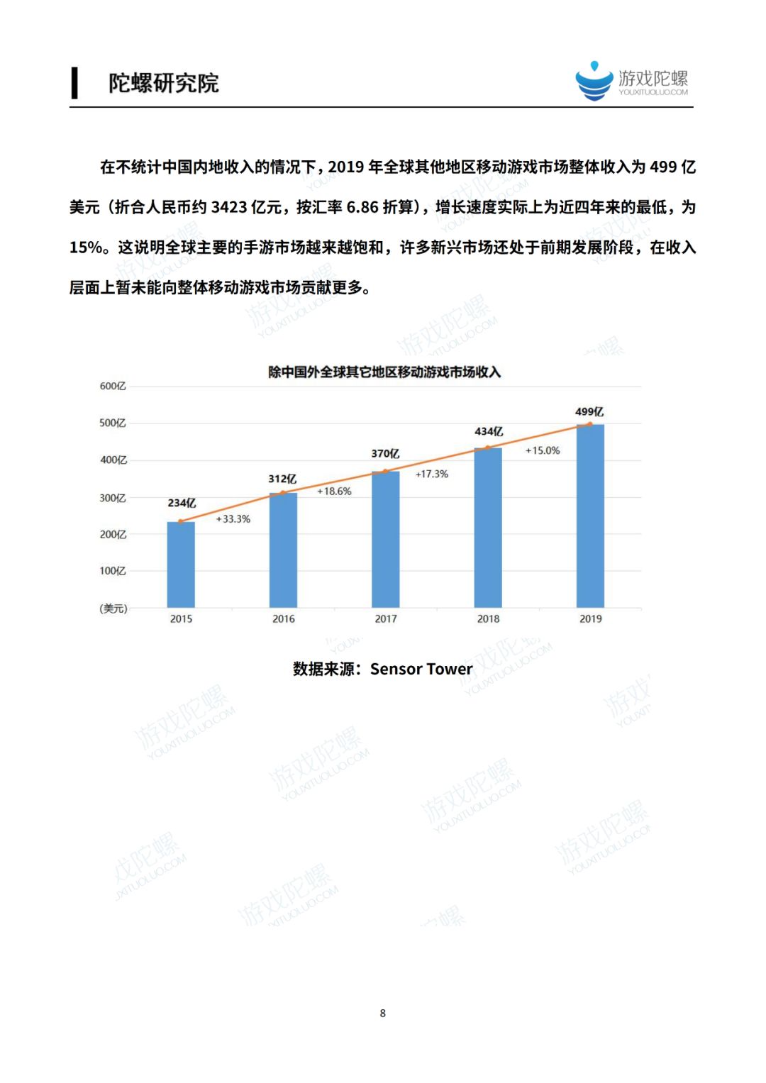从整体规模看,在不统计中国内地收入的情况下,2019年全球其他地区移动游戏市场整体的收入为499亿美元(折合人民币约3423亿元,按汇率6.86折算),增速虽然为近四年来的新低,但依然保持高速增长,达到15%。