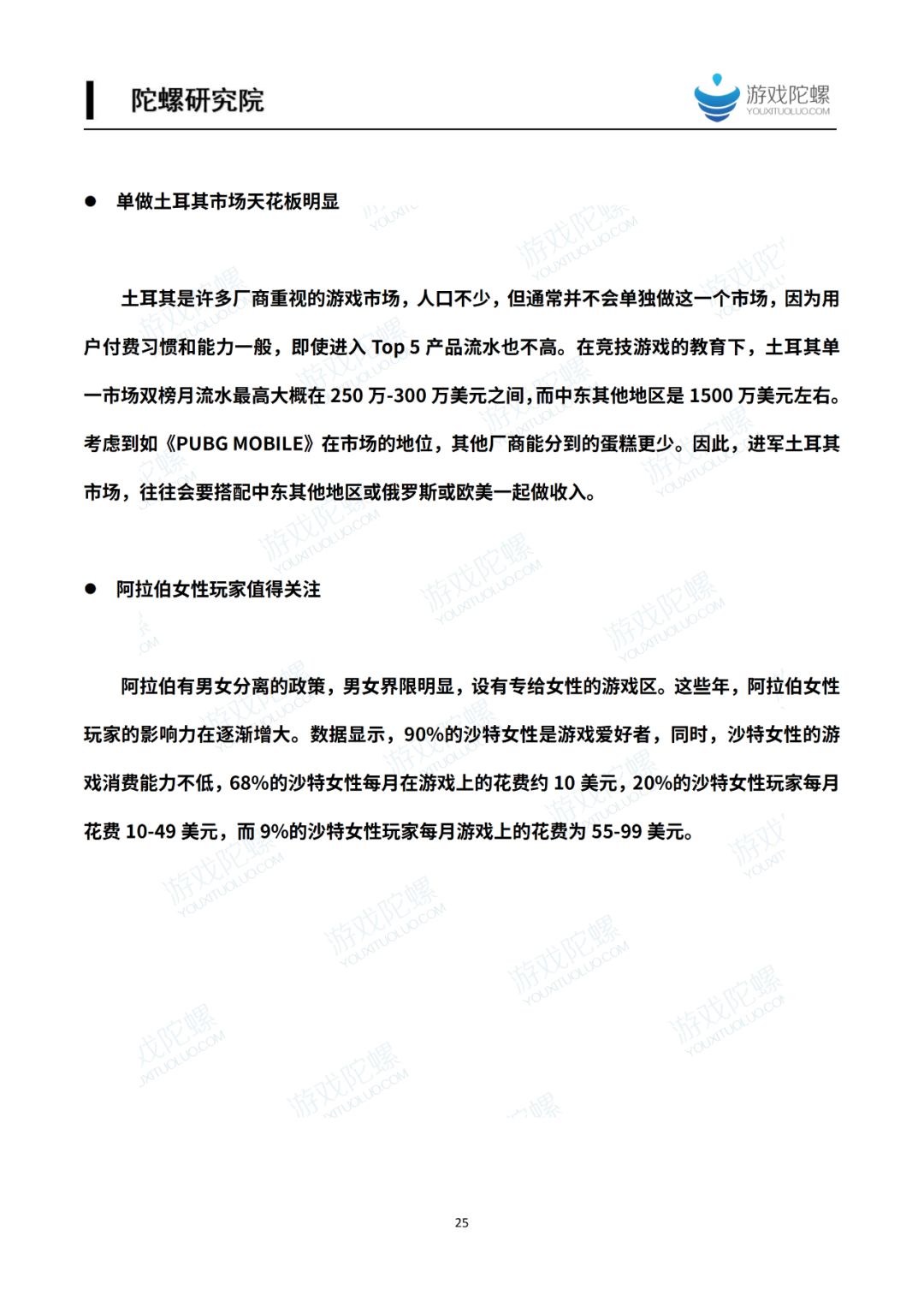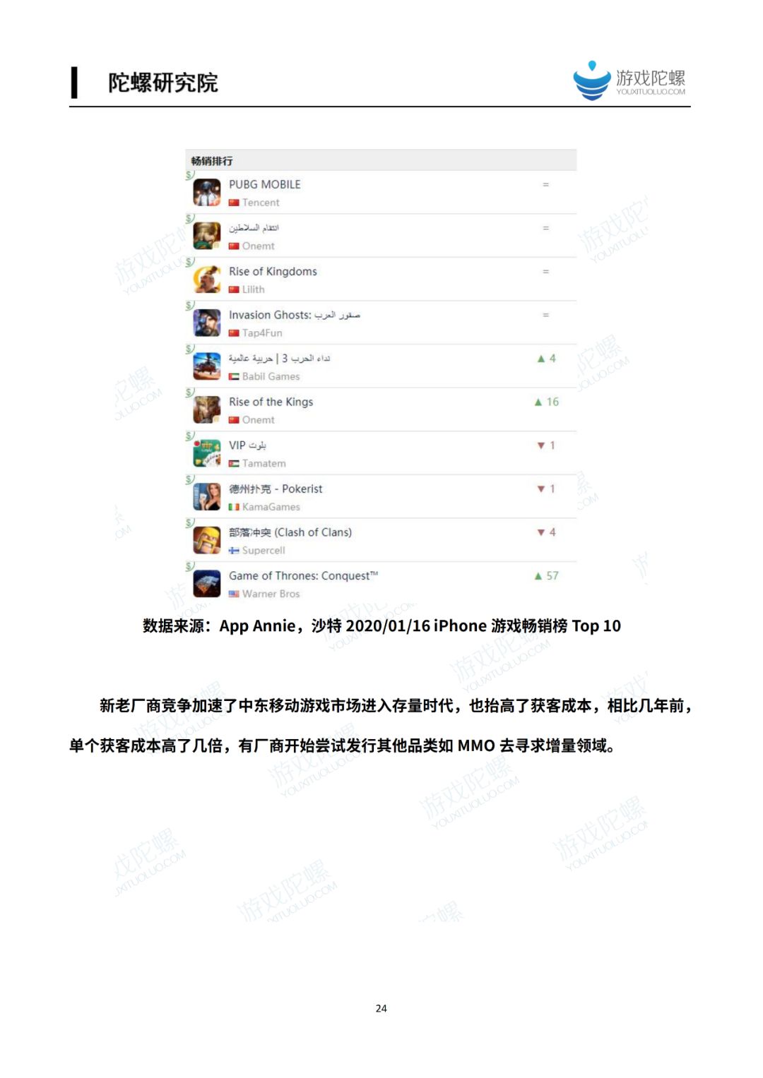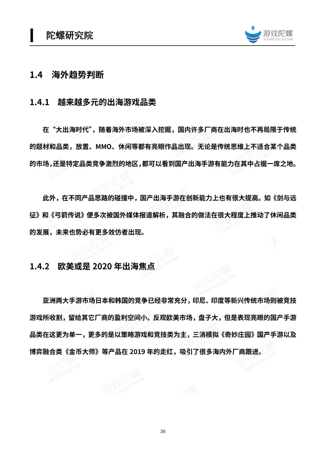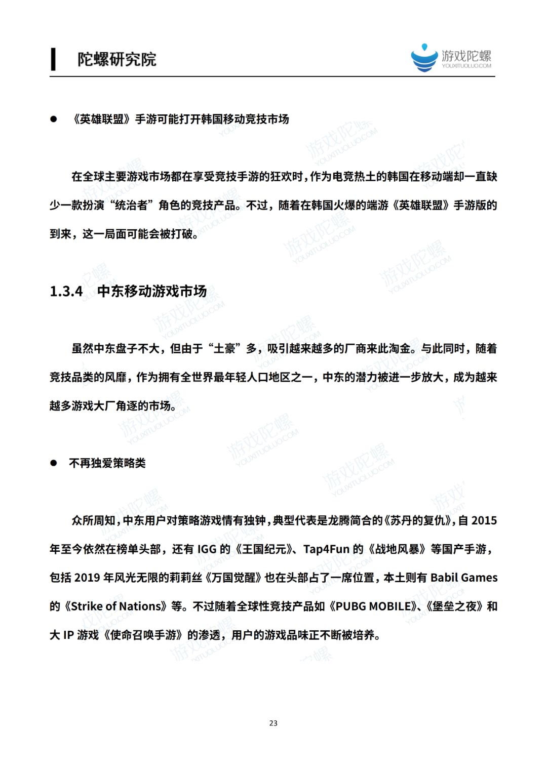 我们判断,鉴于休闲融合类产品的持续爆发以及美国市场的巨大增幅,以美国为代表的欧美或是2020年国内出海厂商关注的焦点。至于亚洲两大市场——日本和韩国,虽然存量竞争激烈,但热度高涨,比如韩国,过去一年出现了好几款国产手游爆款,受此刺激,2020年出海韩国的国内厂商数量可能要翻一倍。而中东是全球拥有较多年轻人口的地区之一,在竞技品类的培育下,中东用户不再独爱策略类,潜力被进一步放大。