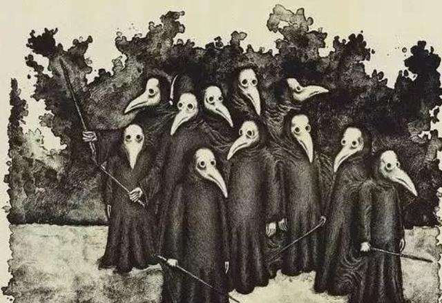 发展到后来,仍在依靠治疗黑死病谋生的行医者不得不用一套名为乌鸦面具的装束来保护自己。顾名思义,这只面具有着长长的鸟喙,方便医生在低头观察病情时注意与病患保持距离,鸟喙里塞满龙涎香、薄荷叶等草药,因为人们深信芬芳物质可以帮助他们过滤瘴气。然后披上黑色斗篷,手持长棍以避免直接触摸病人,于是鸟嘴医生便粉墨登场。