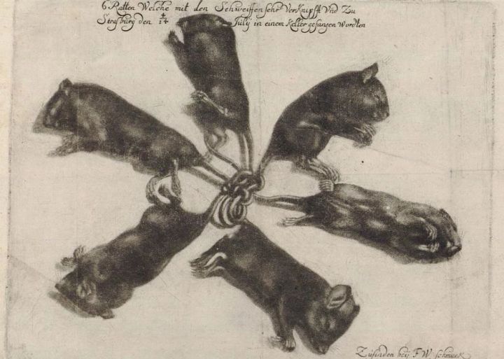 其实“鼠旋风”不是凭空虚造的。中世纪的时候,人们就亲眼看到过数只老鼠将尾巴缠绕在一起,转着圈移动,死也不分开。耸人听闻的景观为它们博得了一个恐怖称谓——“鼠王”。
