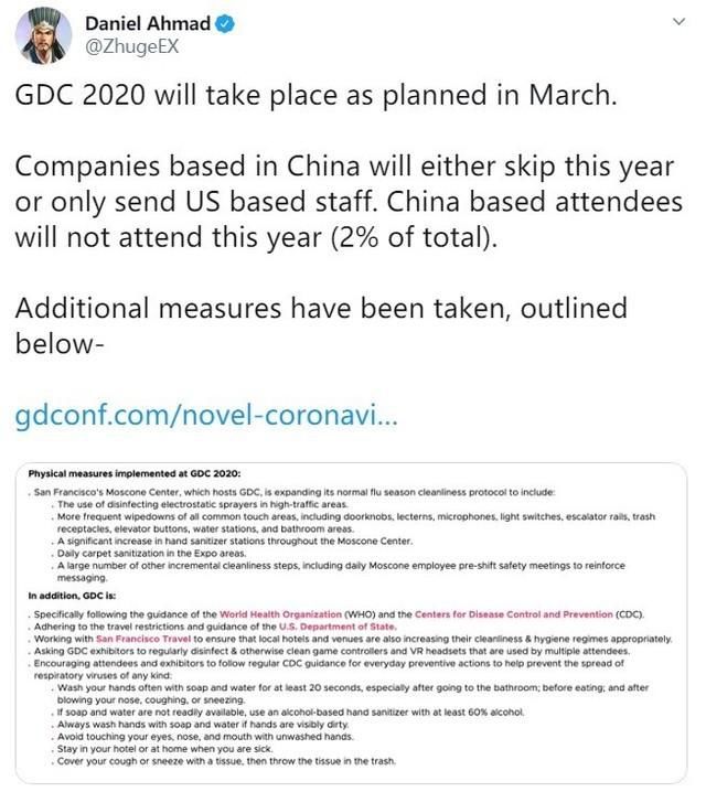 Daniel Ahmad在推特上称:“GDC 2020(游戏开发者选择奖)将按计划于3月(原定3月16日)举办,中国的游戏公司不会参与今年的大会(中国厂商占总数约2%),另外总部位于中国的厂商将只会派美国分部的工作人员参与大会。”