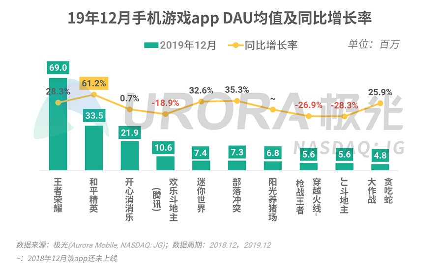 《和平精英》DAU均值同比增长率高达61.2%,突围成功;相反,《腾讯欢乐斗地主》增长率同比下降近20%,可见用户对休闲类手游的热情较2018年有所降低。