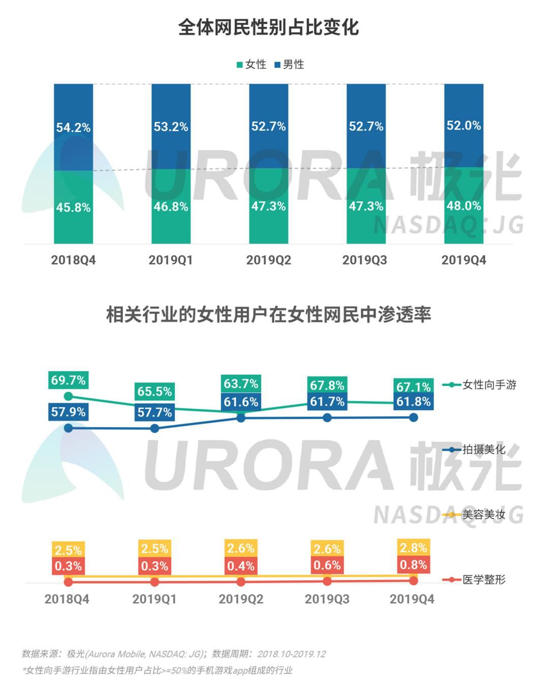 2019年,全体网民性别比例越来越均衡,女性网民占比在2019年Q4稳步上升至48%,以女性用户为主的相关行业App在女性网民中的渗透率也均有所增长。