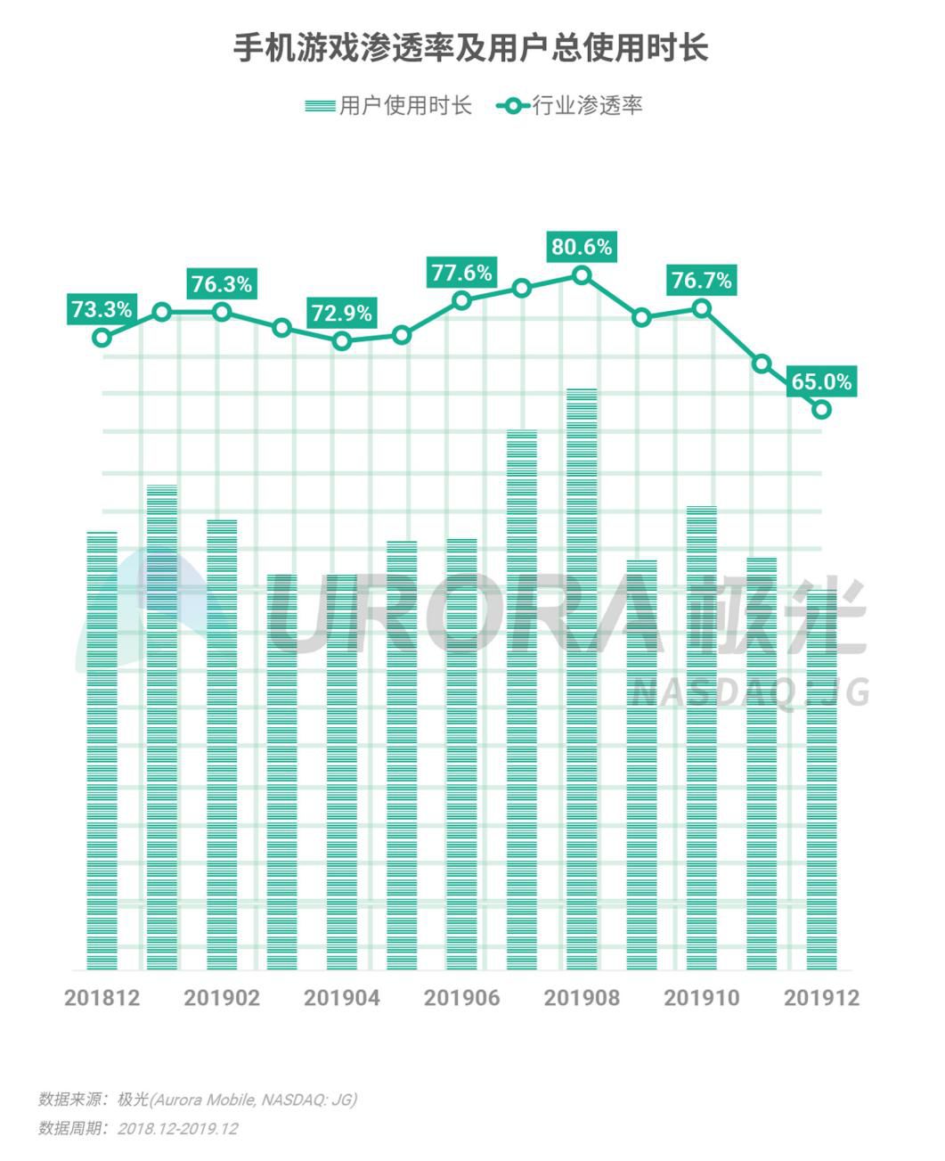 用户总使用时长的趋势与渗透率大体一致,年末手机游戏行业使用总时长创新低。
