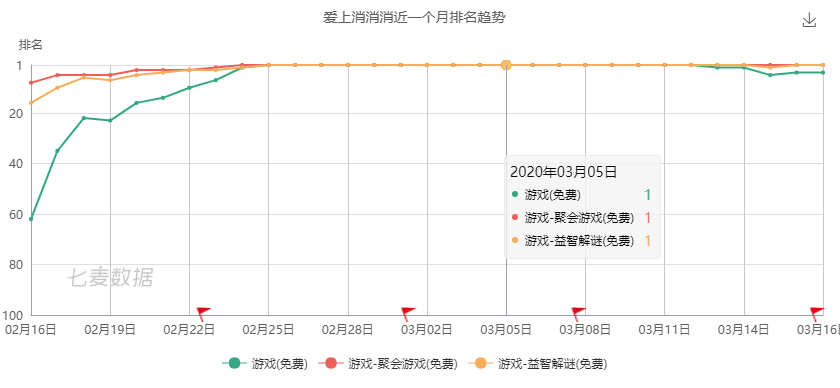 根据七麦数据显示,自2月下旬开始,该产品在iOS平台上连续霸榜17天,目前仍保持在TOP5位置。另外,其下载量统计还显示,过去半个月,《爱上消消消》在iOS平台每日下载量均超10万。