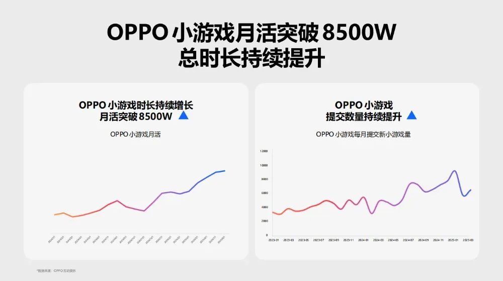 从 OPPO 小游戏沙龙上公布的数据趋势来看,答案是积极的。OPPO 小游戏的月活用户已突破 8500 万,并且用户总时长仍在持续增加。这说明 OPPO 的小游戏生态本身是繁荣且有活力的,它有足够健康的用户基础,来承接和扶持开发者的产品。