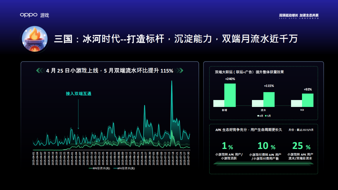 把这些能力和逻辑结合起来,最终效果如何?SLG游戏《三国:冰河时代》验证了这套模式在快速起量和商业化上的潜力。游戏在接入双端后,当月新增用户环比提升了 240%,双端总流水增长了 115%。