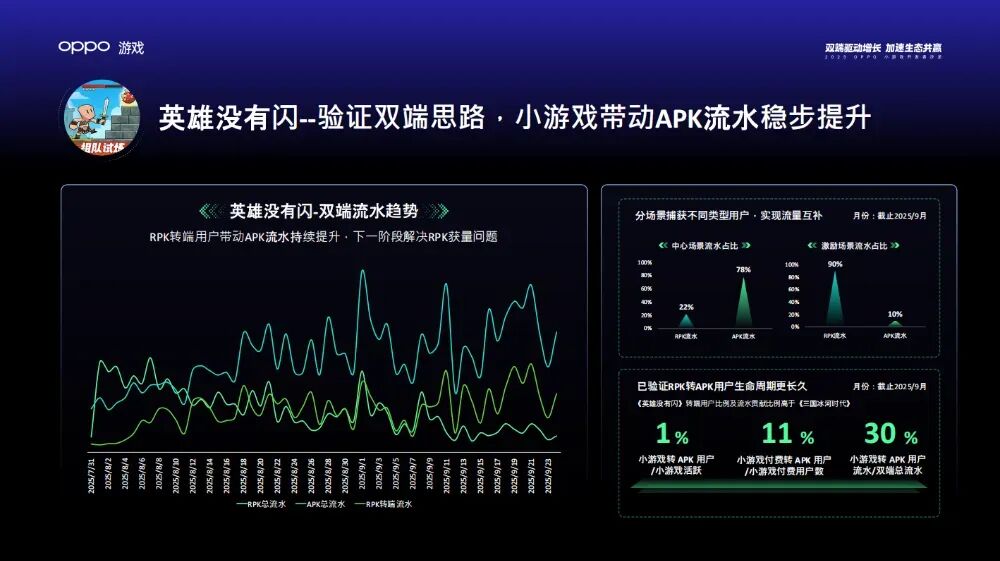 而另一个案例《英雄没有闪》,则从长线运营的角度,证明了转端用户的更高价值。它的数据显示,从小游戏转化而来的用户,贡献了App端总流水的 30%。在小游戏有付费的用户转端到 APK 的比例达到了 11%。