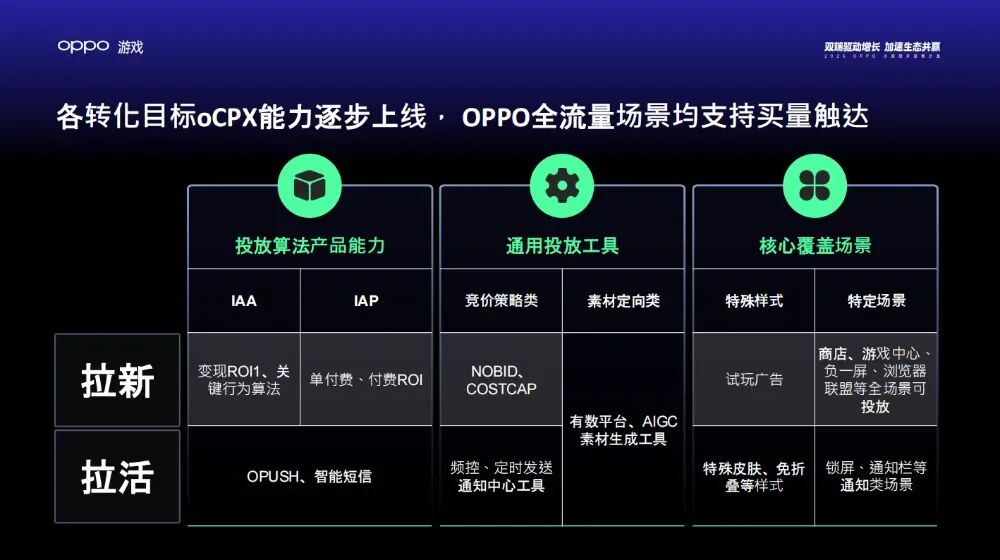对于需要买量的团队,OPPO 也提供了更智能的工具。平台有一整套智能投放产品(oCPX),无论开发者的目标是拉新还是促活,都有对应的算法和投放方式。比如“快应用变现ROI1”、“OPUSH召回”这类工具,能让开发者直接设定回报目标,由系统自动优化投放,大大降低了中小团队的投放门槛。