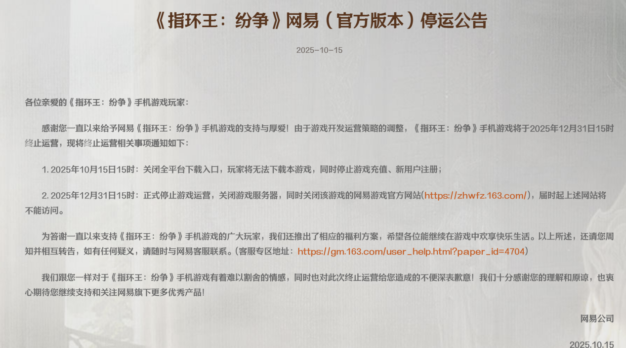 昨日(10月15日),网易游戏旗下SLG手游《指环王:纷争》发布停运公告,宣告其游戏旅程即将终结。该游戏于2024年5月开启公测,运营时间仅约一年七个月,便因“开发与运营策略调整”而黯然退场。