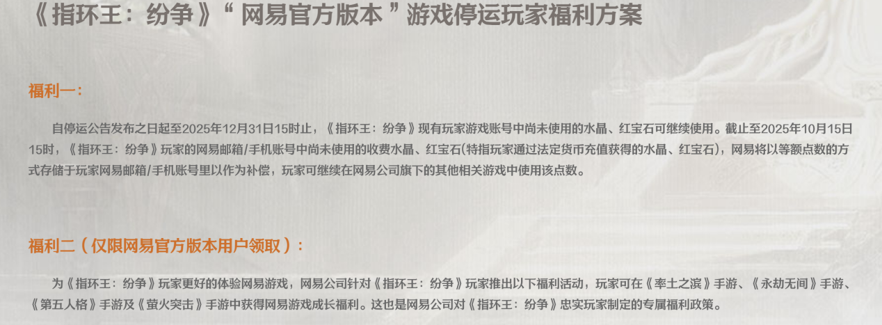 尽管游戏停运,网易公布了相应的玩家补偿方案。在停运前,玩家账号内未消耗的虚拟货币可继续使用;对于在2025年10月15日15时后账号内剩余的付费货币,将按比例兑换为等额点数,可用于《率土之滨》《永劫无间》《第五人格》及《萤火突击》等网易旗下其他指定游戏。同时,符合条件的老玩家还可领取上述四款游戏的专属成长福利。