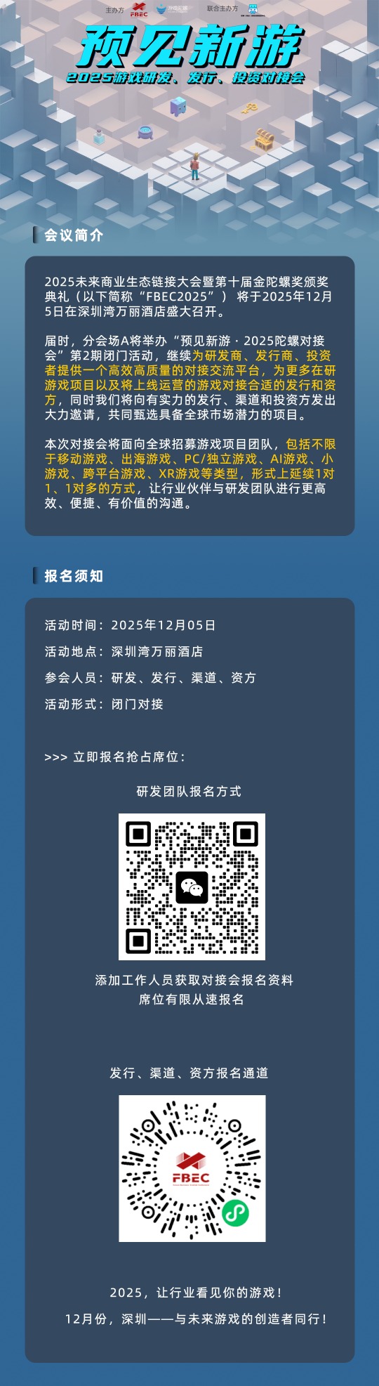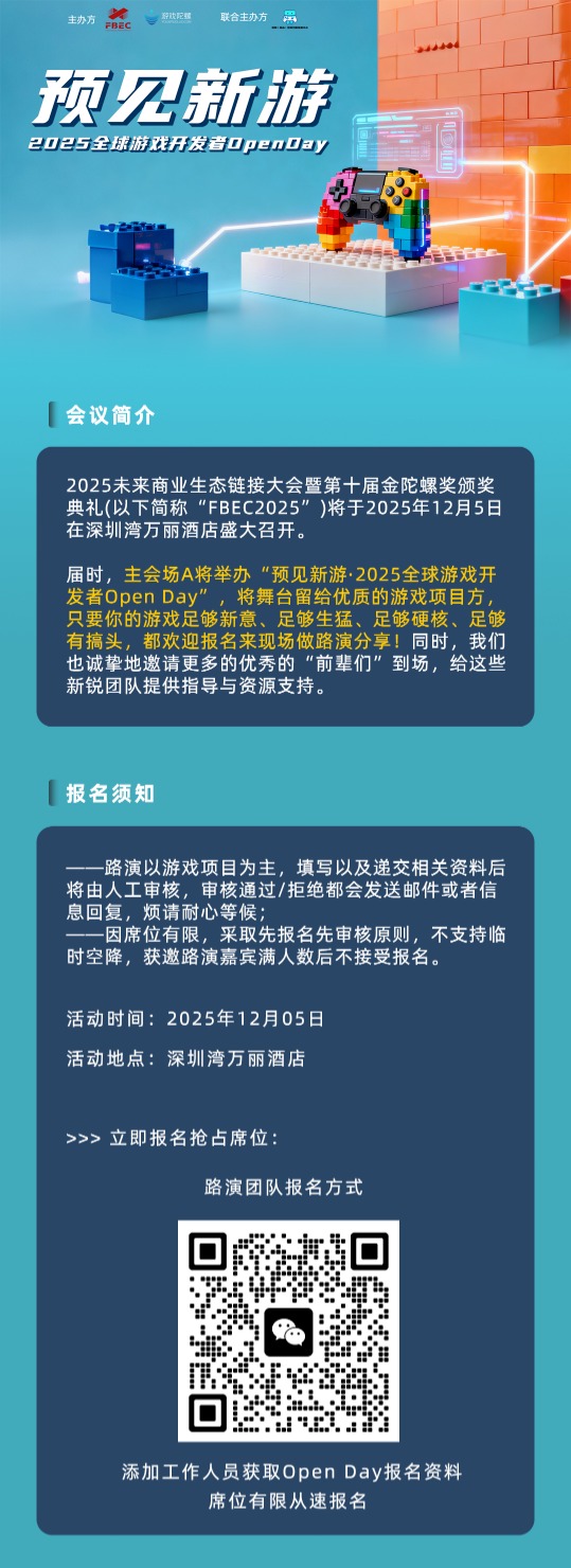 届时,大会将同步举行两大游戏专场活动——“2025全球游戏开发者Open Day”与“2025游戏研发、发行、投资对接会”。目前活动报名通道已全面开启,诚邀全国游戏行业伙伴踊跃参与。