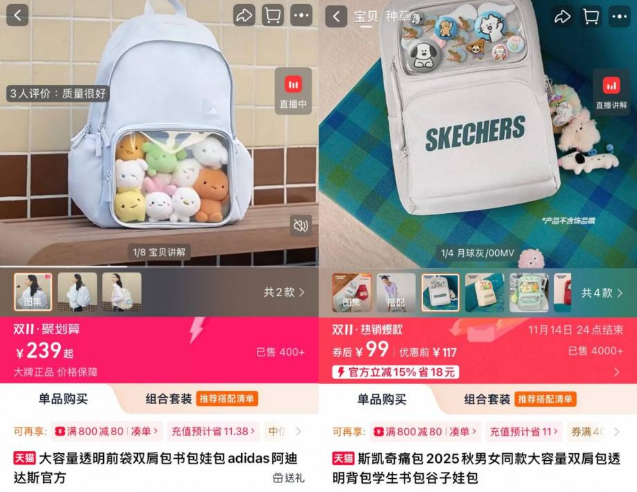 除了谷圈人手一个的日本品牌WEGO的“大肠痛”和“丝带痛”外,Adidas、Lee、SKECHERS 等主流品牌也纷纷入局,推出带有透明“痛层”设计的背包,试图在“日常实用性”与“兴趣表达”之间找到平衡。
