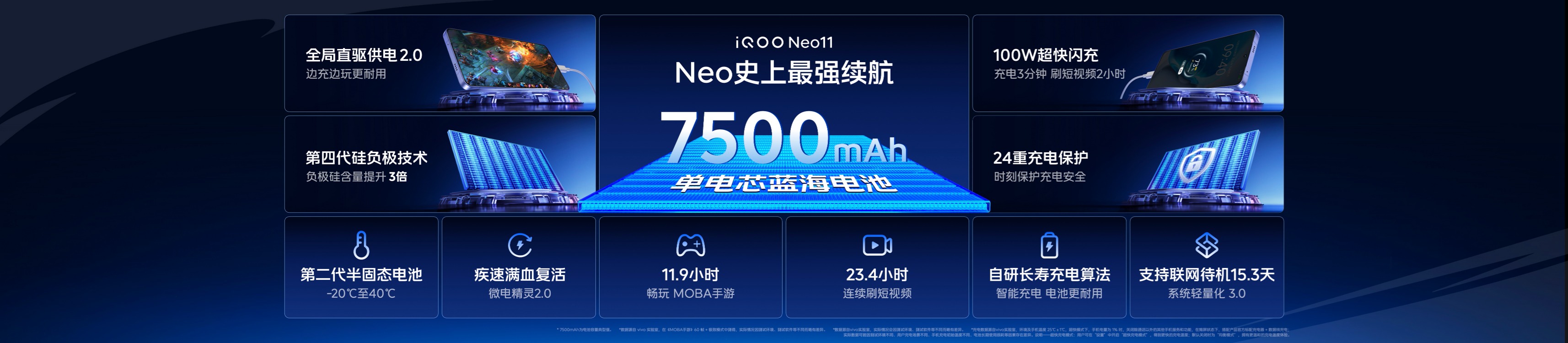 Neo11 实现 Neo 史上最强续航表现,搭载配备了第二代半固态电池技术和第四代硅负极技术的 7500mAh 超薄蓝海电池,即使在 -20℃ ~ 40℃ 的环境中,依然能稳定持久放电,并配备 100W 超快闪充且支持 PPS 和 PD 快充协议,让充电更自在;全新升级的全局直驱供电 2.0,支持智能温控,做到发热更低、损耗更少,有效延缓电池老化,边充边玩也安心。