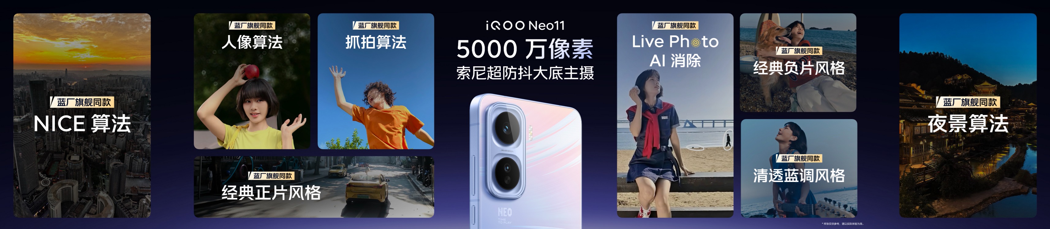 iQOO Neo11 配备后置 5000 万像素索尼超防抖大底主摄,并得到蓝厂旗舰同款 NICE 算法加持,同时影像玩法也有升级,全新的风格化光斑、负片、正片和清透蓝调等滤镜以及升级的 LivePhoto 动态照片、LivePhoto AI 消除和 AI 修图大师等,让出片更轻松。