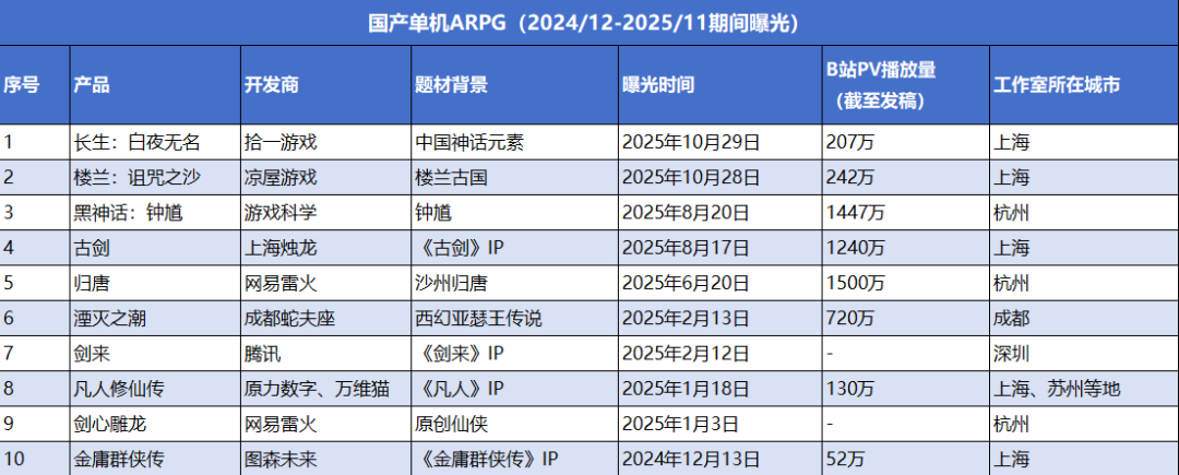 为此,陀螺也统计了近一年时间内(2024/12-2025/11)曝光的国产单机ARPG新品,以及游戏背后工作室的情况: